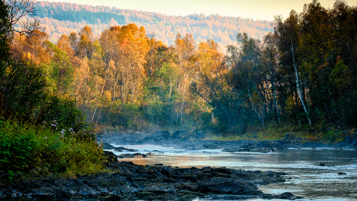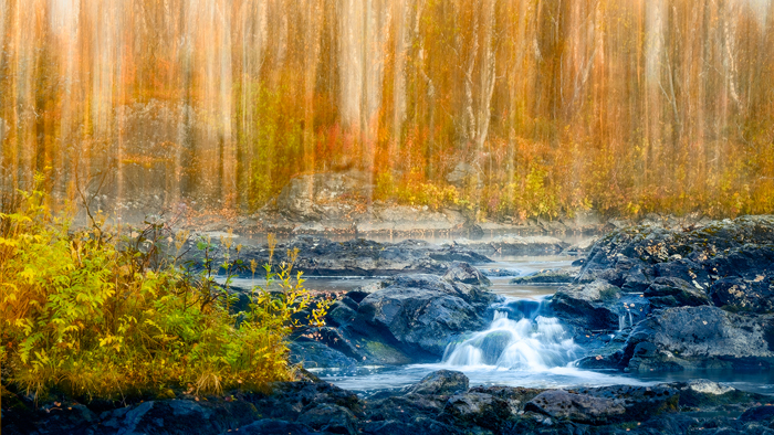 Next morning it felt good being in bed. My body underneath the quilt was comfortably warm but my nose was freezing. I had a look at the thermometer: 6º in bed and 2º outside….. I peeked through the window: fog.  Wow! Time to get out, big chance for good images.  It was 6h30 and only 15 minutes left for the first sun rays veiled by the fog, adding mystery to the forest.  But it fades fast and when I arrived at the river, the canopies of the trees were lighting up and greeting me with a show of yellows oranges and golden reds. There was music, it’s the water running in between the rocks.  The trail was like a carpet of autumn coloured leaves sneaking between the thick moss cover, red berries and  mushrooms of all shapes.  If I had turned the corner and suddenly was facing a gnome,  it would have been the most natural thing happening this place 😊